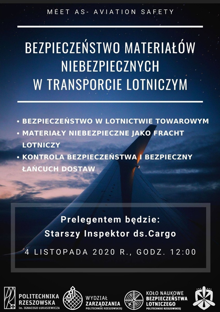 Dnia 4 listopada 2020 r. Studenckie Koło Naukowe Bezpieczeństwa Lotniczego „Eskadra”, działające przy Wydziale Zarządzania PRz, rozpoczęło cykl spotkań „Meet AS – Aviation Safety”.